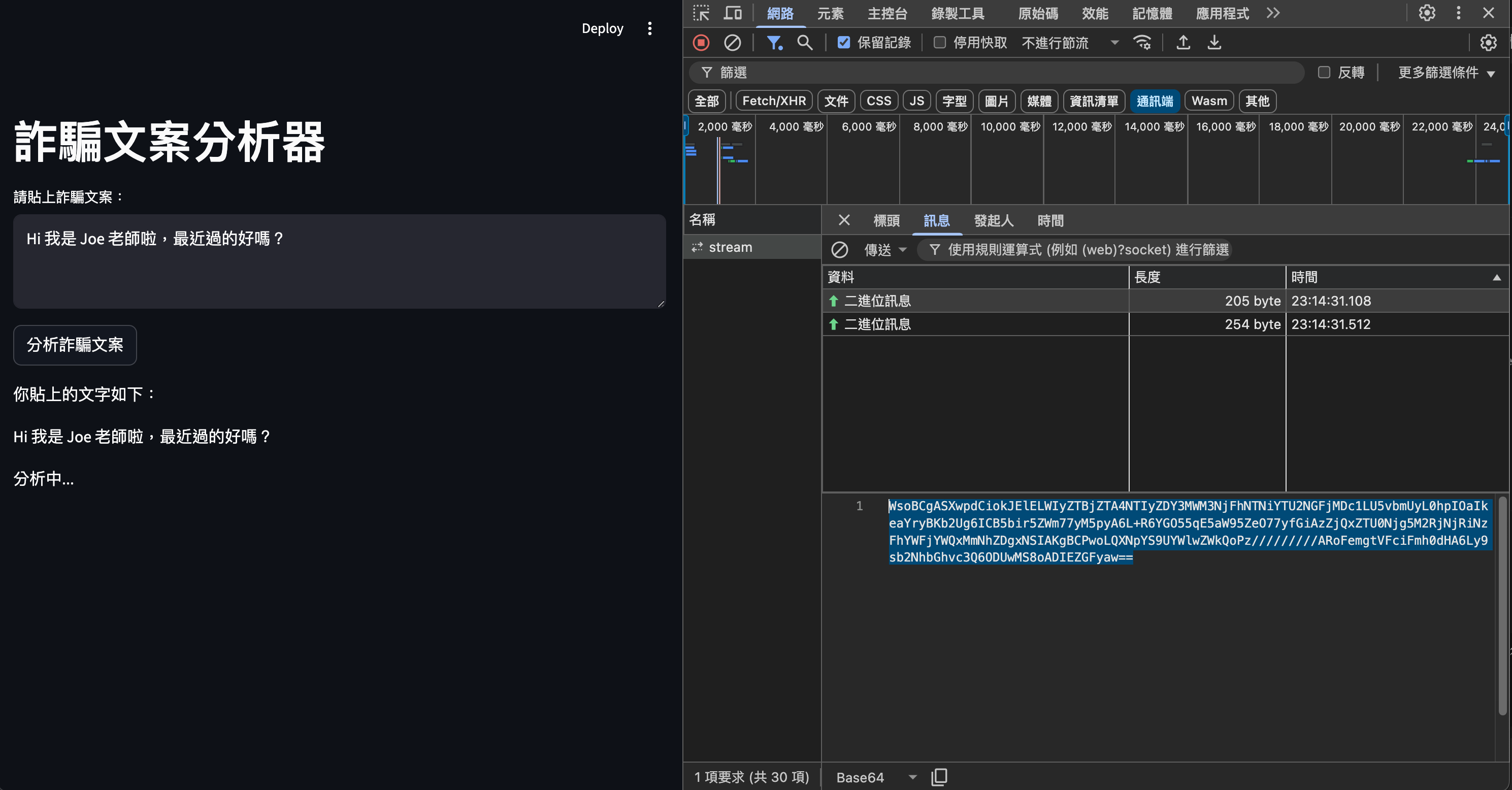 接著我們試著輸入一段文字送給後端,並觀察 WebSocket 傳送的訊息,可以得到一個 base64 編碼的二進位檔案。