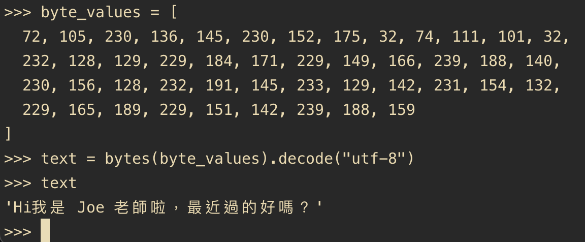 拿到這串二進位資料後,用 Python 轉回 UTF-8 字串: