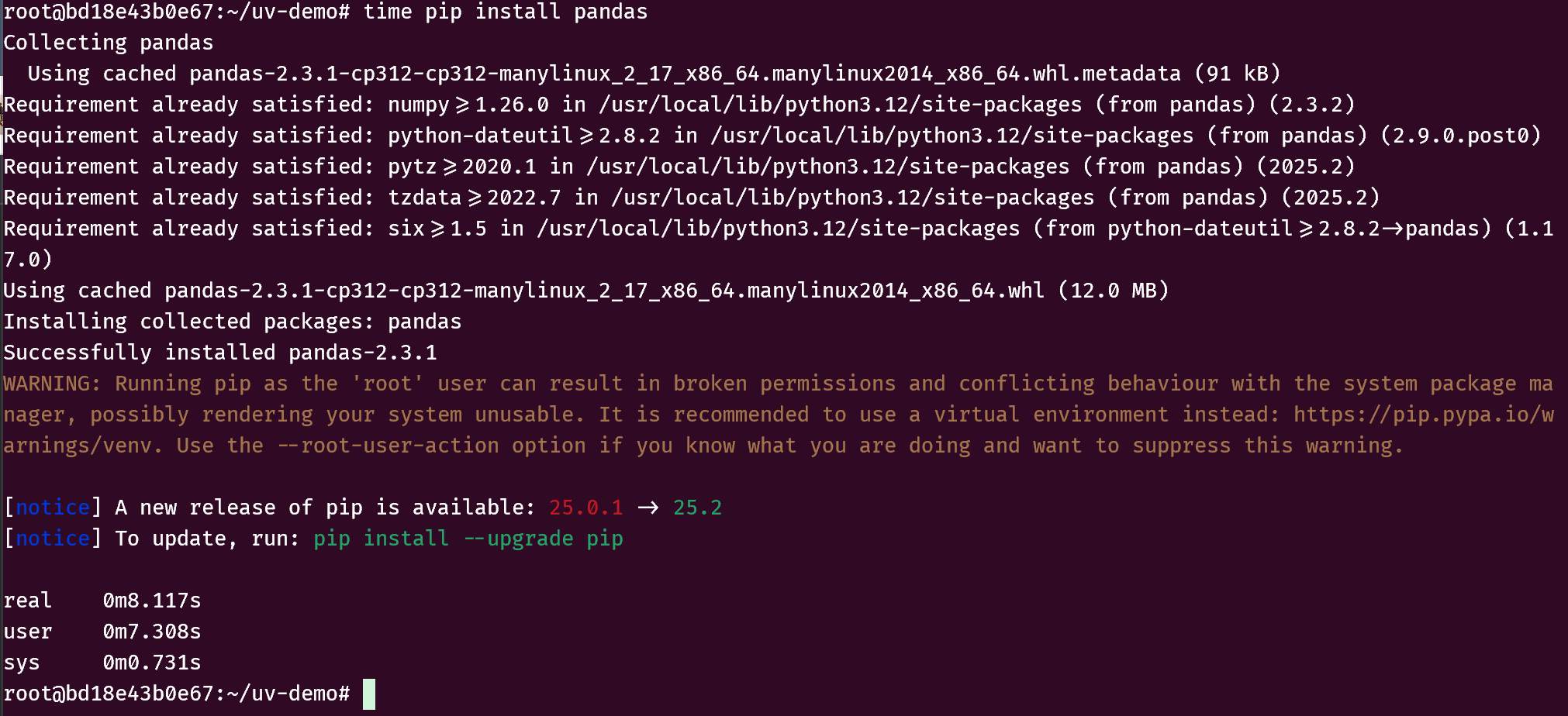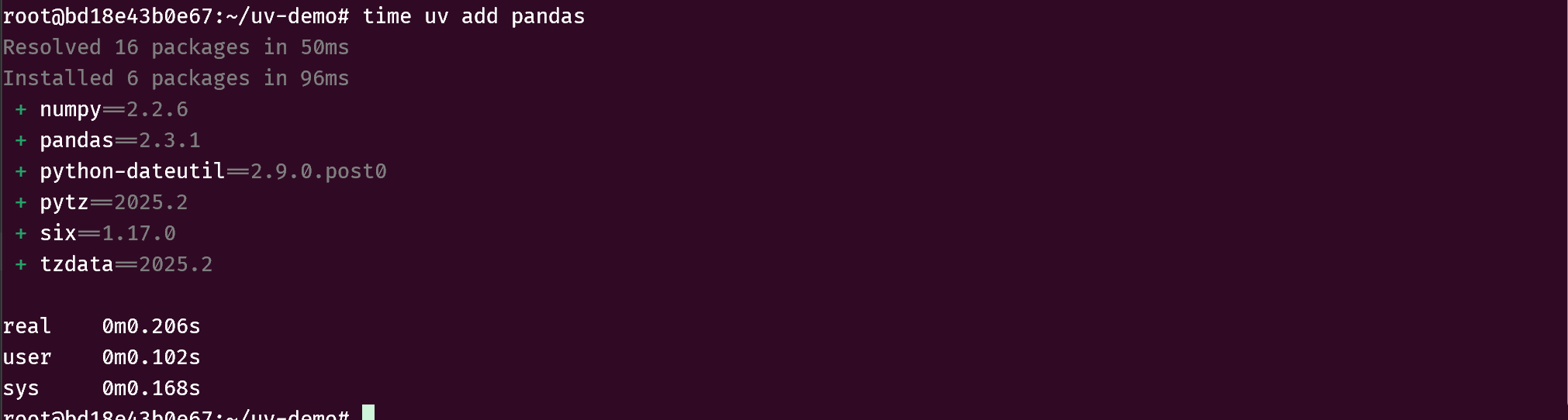 從這個測試可以看到,不論是使用 uv pip 或是 uv sync,花費的時間都是差不多的,而且遠快於直接使用 pip 安裝。