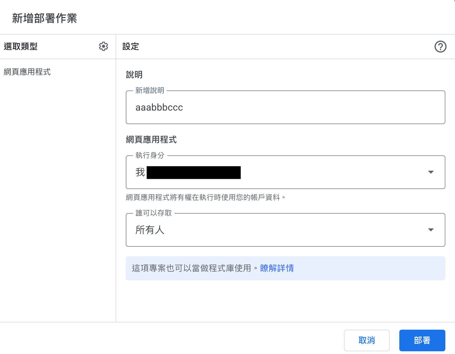 部屬成功後會得到一個像這樣的 URL: https://script.google.com/macros/s/AKfycbxOFRfffExrffffsaaa63opssssss-kffsssFRffT5Y-y8hBBBBCCC/exec,這個就是我們服務的對外 URL。是的你沒看錯,連 HTTPS 都幫忙搞定了。