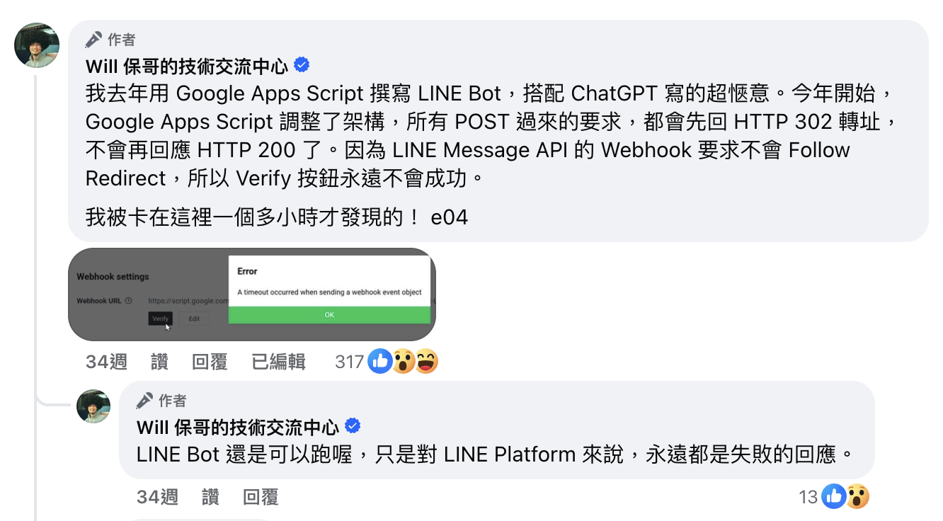 這個是目前唯一沒解決的問題,從 Line Messaging API server 發送過來的請求要在 1s 內回覆 HTTP 200 不然就會被視為失敗,觸發 Line Messaging API 的重試機制,會每隔一段時間重新發送重複的訊息 (記帳 sheet 上會多出一堆相同的紀錄)。